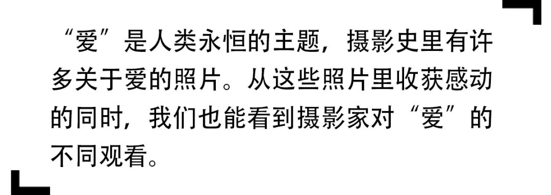 关于“爱情”,有的摄影师以旁观的姿态展现瞬间,也有的把镜头对准自己的爱人,记录自己的生活。罗伯特·杜瓦诺(Robert Doisneau)的《市政厅之吻》是炽烈的法式爱情的象征。它常被当作一张街头抓拍的浪漫瞬间,但事实上,杜瓦诺请了模特,当时肖像权已经受到法律保护,杜瓦诺称出于谨慎,他更喜欢让朋友在一些受委托的报道摄影中出镜。