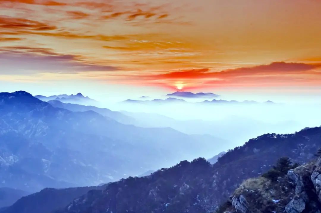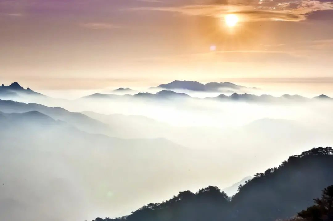 最后,太阳渐渐地从地平线上钻出来, 慢慢地升起,随后射出道道金光照耀万物。烟笼雾罩之时,山下一望无际的云雾,随风升腾翻涌,似海浪滚滚,气壮山河。