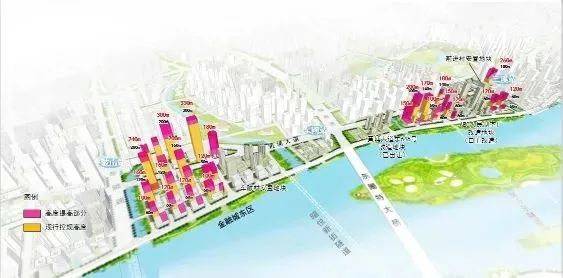 本次规划调整将金融城东区的控高从300米调整到330米,延续原控规两端高,高旁有矮的沿江多峰簇群形态。以金融城起步区(450米)和黄埔港CBD(488米)作为至高地标簇群;金融城东区范围内两个次高簇群为——330米的地铁车陂南站簇群和260米的地铁三溪站簇群,衔接金融城起步区和黄埔港CBD,打造珠江沿岸错落有致的天际线。
