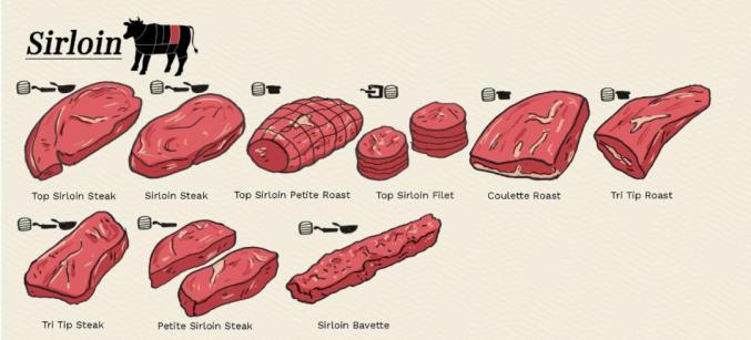 斜腹肉(bavette)、下腰三角肉(tri-tips),这些是比较瘦的肉,如果您想慢炖牛肉,这些肉不是最佳的选择。沙朗牛肉则最适合烧烤、煎和炒之类的干烧烹饪。