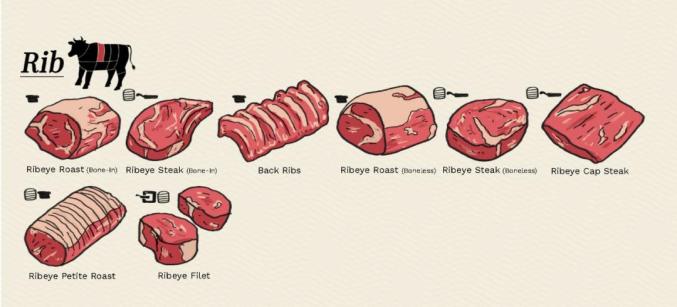 肋眼牛排(Ribeye filet)、老饕牛排/眼肉盖牛排(ribeye cap)等,这里肉质肥嫩,这意味着有些肉更适合慢煮和烤。但并不是所有肋骨切块都适合慢火烹调,例如肋眼牛排就是个例外。