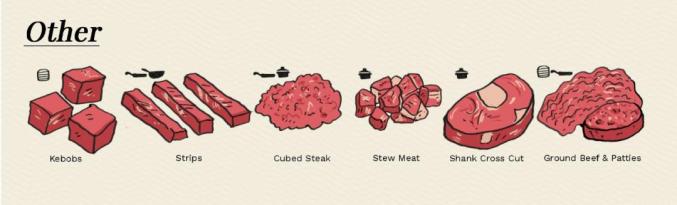 牛肉切块有各种形状、大小、质地和味道,正所谓“牛浑身都是宝”。“其他”一词涵盖了所有不属于一般家庭常见的切块。这一类有炖牛排、牛肉汉堡、腌牛肉、碎牛肉和牛肉馅等。来自牛腿的小腿肉可能是最有趣的牛肉切块之一,非常适合慢火烹调。