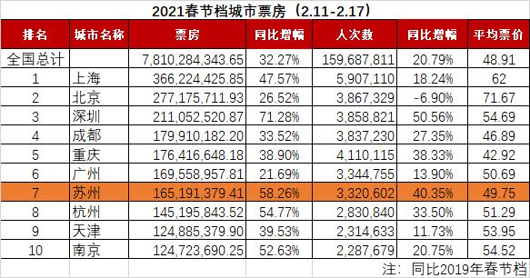 同比2019年,苏州票房和人次增幅约为58%和40%,位列全国十大票仓城市第二,仅次于深圳,远高于全国平均增幅32%和21%。
