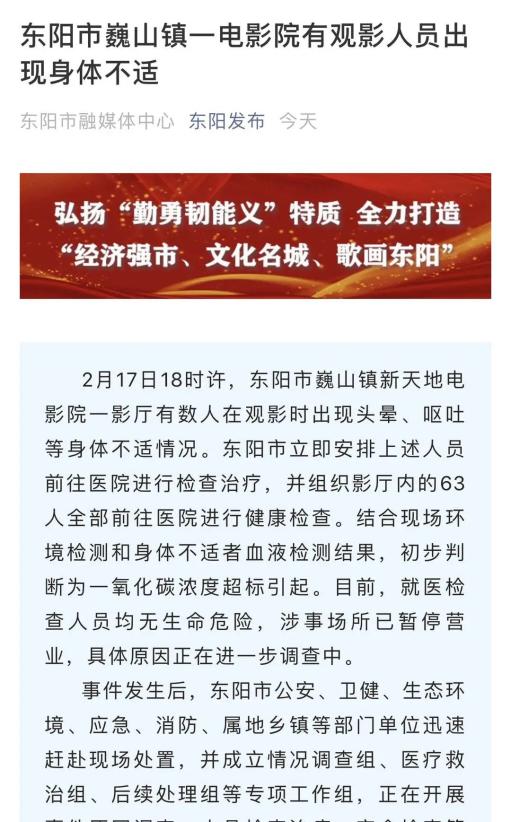 据“东阳发布”2月18日消息,2月17日18时许,浙江东阳市巍山镇新天地电影院一影厅有数人在观影时出现头晕、呕吐等身体不适情况,东阳市立即安排上述人员前往医院进行检查治疗,并组织影厅内的63人全部前往医院进行健康检查。