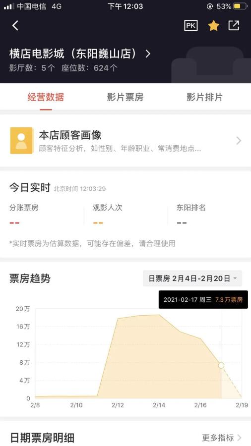 影院2月17日事发当天收获7.3万元票房根据猫眼影院院线数据统计,涉事影城开业6天收获电影票房81.3万,其中,2月17日当天的票房收入为7.3万,是开业期间最低的一天。