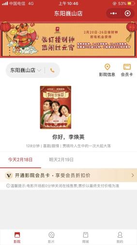 在横店电影小程序上搜索东阳巍山店,2月18日当天暂无排片信息。2月19日只有横店影业联合出品的《你好,李焕英》这部电影排片,11:55、14:20、19:10的3个场次点进去都显示座位已满,无法购票。