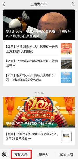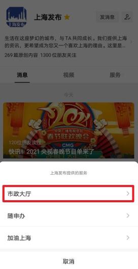 第一步:关注小布微信【上海发布】,选择【市政大厅】↓