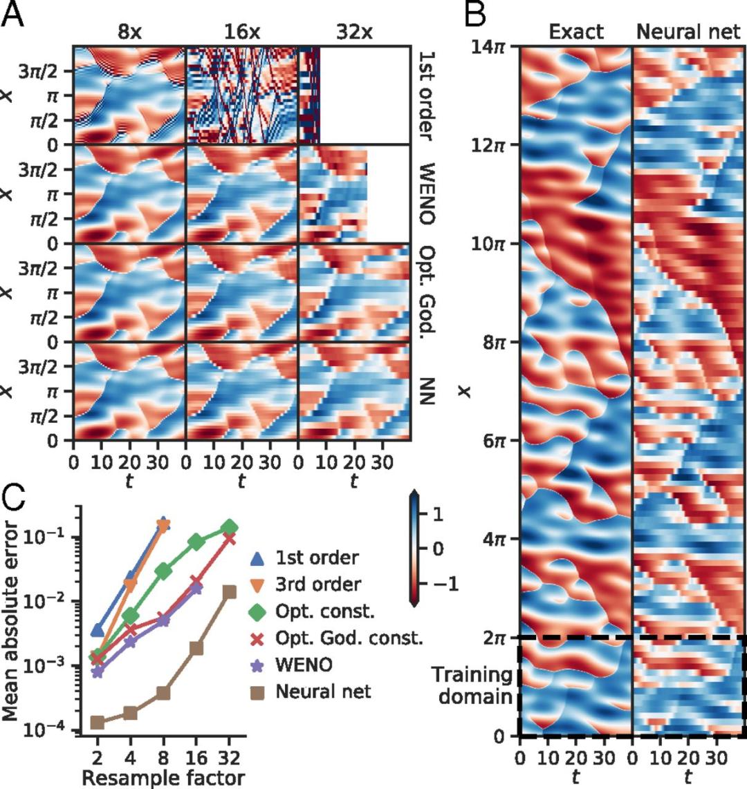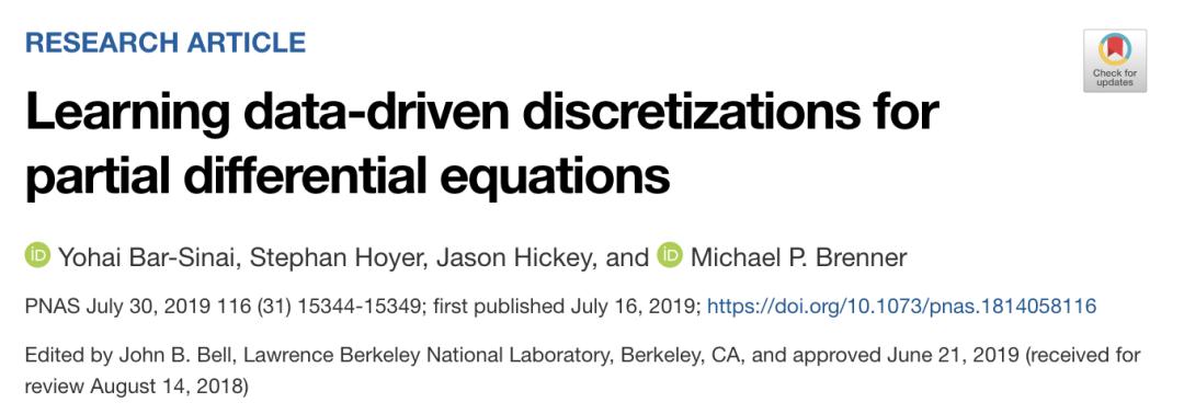 之后的2018年,大名鼎鼎的Google AI研究团队把他们新提出的利用机器学习求解PDE的研究成果发表在期刊PNAS上。这篇论文提出了一种通过机器学习的方法自动对连续的物理方程进行离散化的方法。