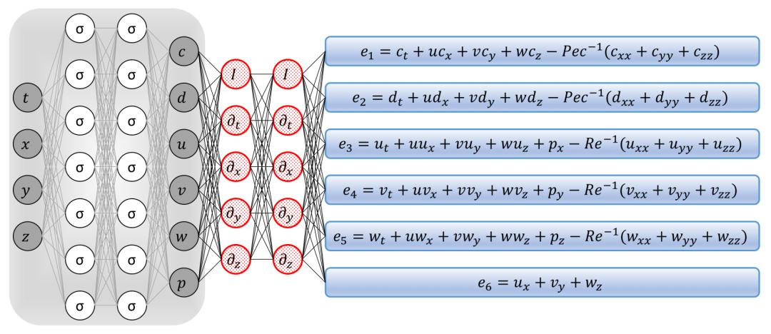 作者们提出了一种叫“隐藏的流体力学”的机器学习框架,英文简称HFM。而这个HFM和前面提到的PINN结构非常像。但是这个HFM的不同点在于作者们在神经网络的结构和物理限制的结构后面(的蓝色盒子)算了一个残差神经网络。