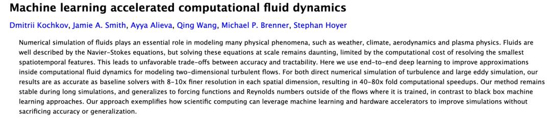在这篇论文中,他们印证了用机器学习算法和TPU硬件加持的情况,计算一个流场,也就是数值解一个N-S方程,能直接加速两个数量级!