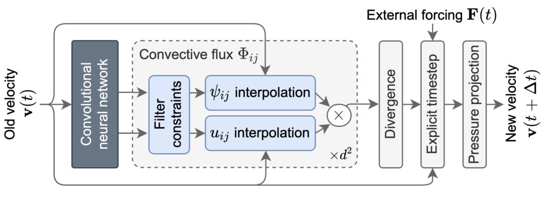 △ 机器学习加速的流体力学算法具体的加速算法其实和上一篇的思路很像:我们知道要想数值求解一个偏微分方程需要把连续的方程离散成一个一个子步骤进行迭代;而作者们就在每一步迭代的过程的中往里面套了一个CNN进去。