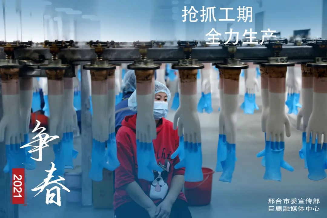 2021年2月11日,工人在河北省邢台市巨鹿县一家医用手套企业车间流水线上工作。戴口罩、讲卫生、测体温、勤消毒。