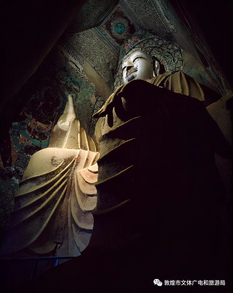 ▲图为莫高窟第130窟,南大像(盛唐),摄影/吴健莫高窟有大量栩栩如生的彩塑,有佛陀、菩萨、弟子、天王、力士像等。十六国、北朝时期的彩塑是古印度犍陀罗、马图拉佛教艺术风格和中国本土艺术风格的结合,表现了宁静沉思的神情。隋唐时期,融合了中外艺术风格,形成了具有中国特色的佛教造像,成功地塑造了比例准确、衣饰华丽、造型健美、神态逼真、不同个性的完美艺术形象,成为具有永恒艺术魅力、经久传世的不朽之作。唐代还以石胎泥塑的技法,分别塑造了高达35.5米的北大像和26米的南大像,以及长达15.8米,表现释迦牟尼佛“涅槃寂静”的大型卧佛像,表现出大唐文化的恢宏气象。唐代以后的许多洞窟多处于下层,塑像多已被破坏。