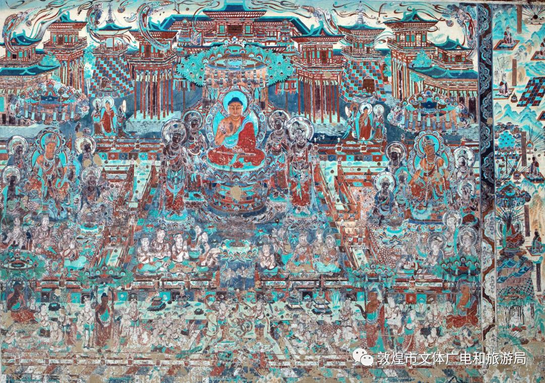 ▲图为敦煌莫高窟第217窟,《观无量寿经变》(盛唐),摄影/孙志军第五类是佛教史迹画,描绘佛教史上的历史故事、传说故事,以及一些佛教圣地、圣迹的故事等。如佛教徒将汉武帝遣张骞出使西域的真实历史,改为汉武帝派张骞到大夏问佛。这纯粹是杜撰的,目的是提升佛教的地位,扩大它的影响。