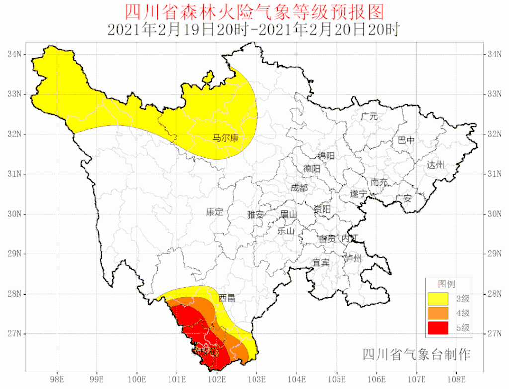 在此期间,夜间气温也将同步上升,但早晚温差始终保持8~10℃的较大幅度。★ 四川省气象台警告,预计2021年2月20~22日甘孜州中部南部和攀西地区大部以多云间晴天气为主,空气干燥,森林火险气象等级可达4~5级。请相关州市加强火源管理,做好森林防火工作。