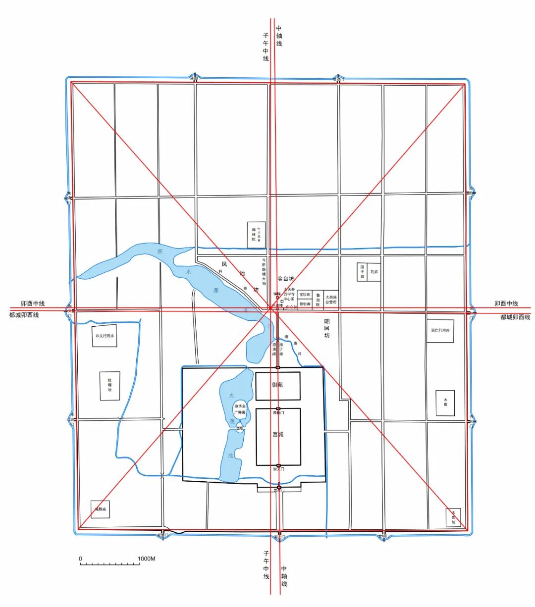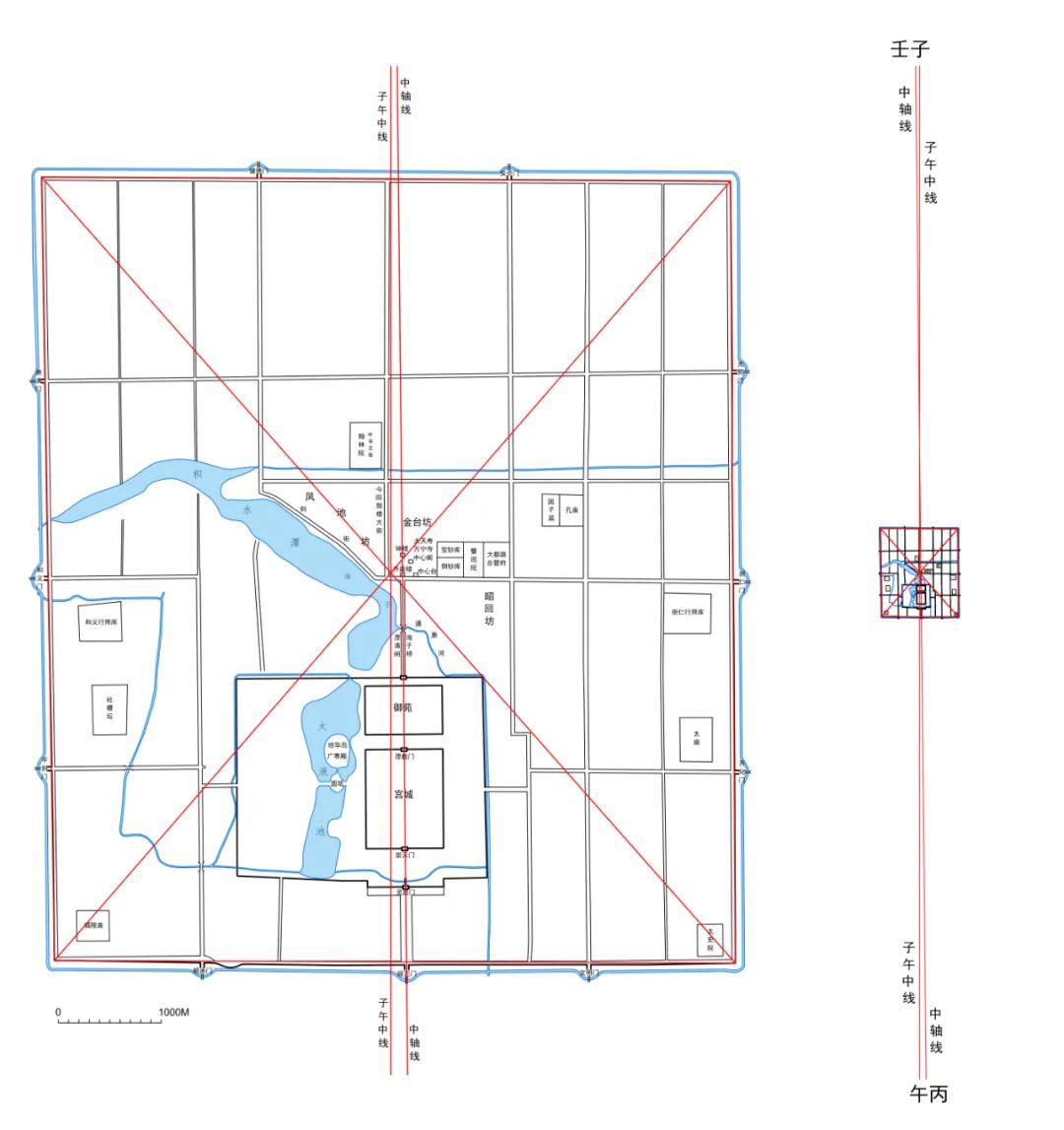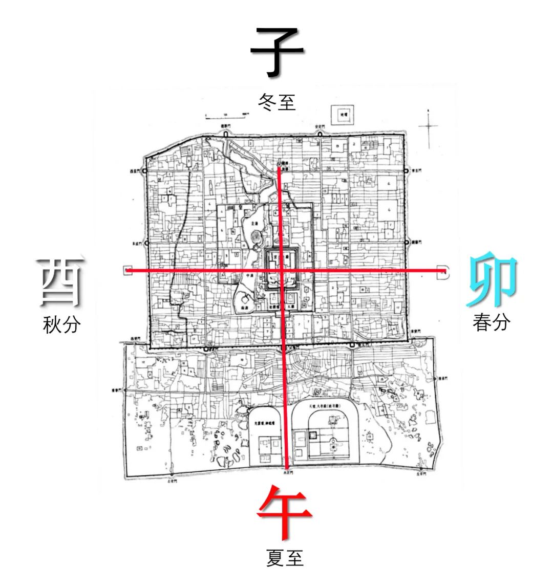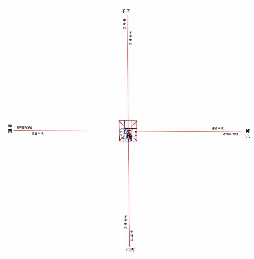 都城中轴线、卯酉线分析图一