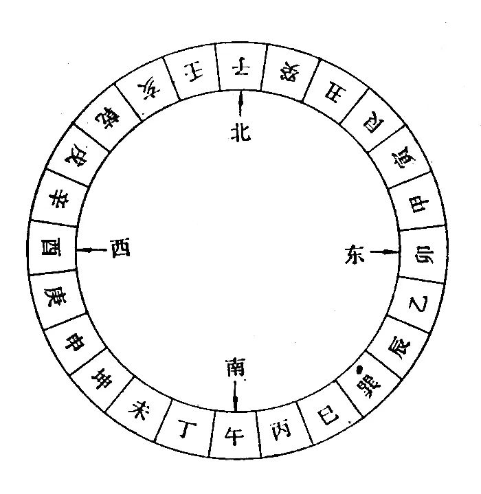 再看方位。中国古代以天干、地支与方位相配,十天干方位是:东方甲乙木,南方丙丁火,中央戊己土,西方庚辛金,北方壬癸水;十二地支则以北方为起点周行相配;再以四维经卦相配,就形成了二十四山方位体系(图 3)。