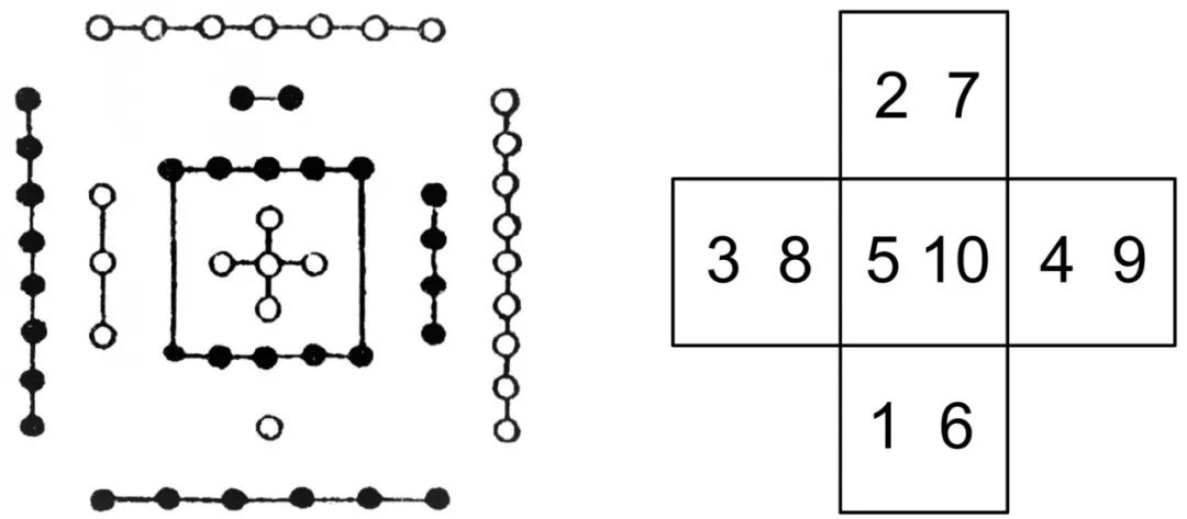 这就形成了以生数一、二、三、四、五和成数六、七、八、九、十标识四方五位的方位体系。其中,一、六配北方为水,二、七配南方为火,三、八配东方为木,四、九配西方为金,五、十配中央为土。每个方位皆以生成数、阴阳数相配(图 5)。