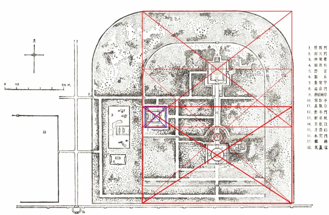 相比之下,与紫禁城同期建成的永乐天地坛则将大祀殿(今祈年殿位置)建于坛区(天坛内坛西墙以东、斋宫南墙东西线以北)的平面几何中心;[24]50 明嘉靖皇帝扩建天坛,则将圜丘建于斋宫北墙东西线以南、天坛内坛西墙以东区域的平面几何中心,将皇穹宇(初称泰神殿)建于大享殿(原大祀殿,今祈年殿位置)以南、内坛西墙以东区域的平面几何中心。这是因为大祀殿、圜丘是祭昊天上帝的场所,皇穹宇是昊天上帝牌位存放处,须与北极对应,与天帝相通(图 11)。
