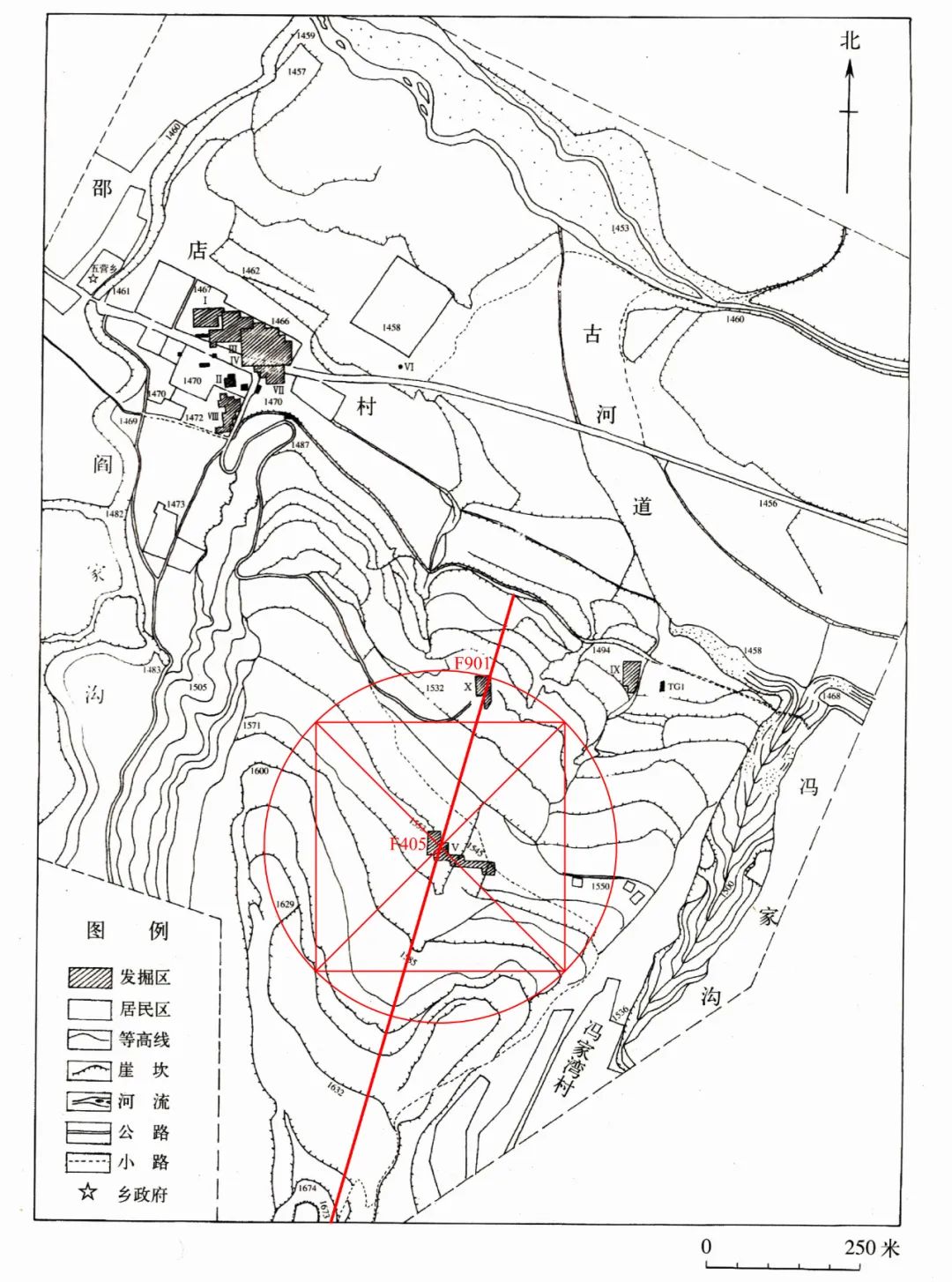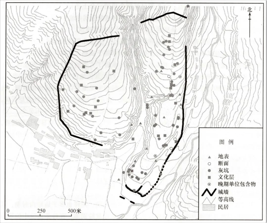 在仰韶文化中晚期的陕西凤翔水沟遗址,亦清晰可见聚落文化遗迹沿山脊走向分布的情况(图17)。