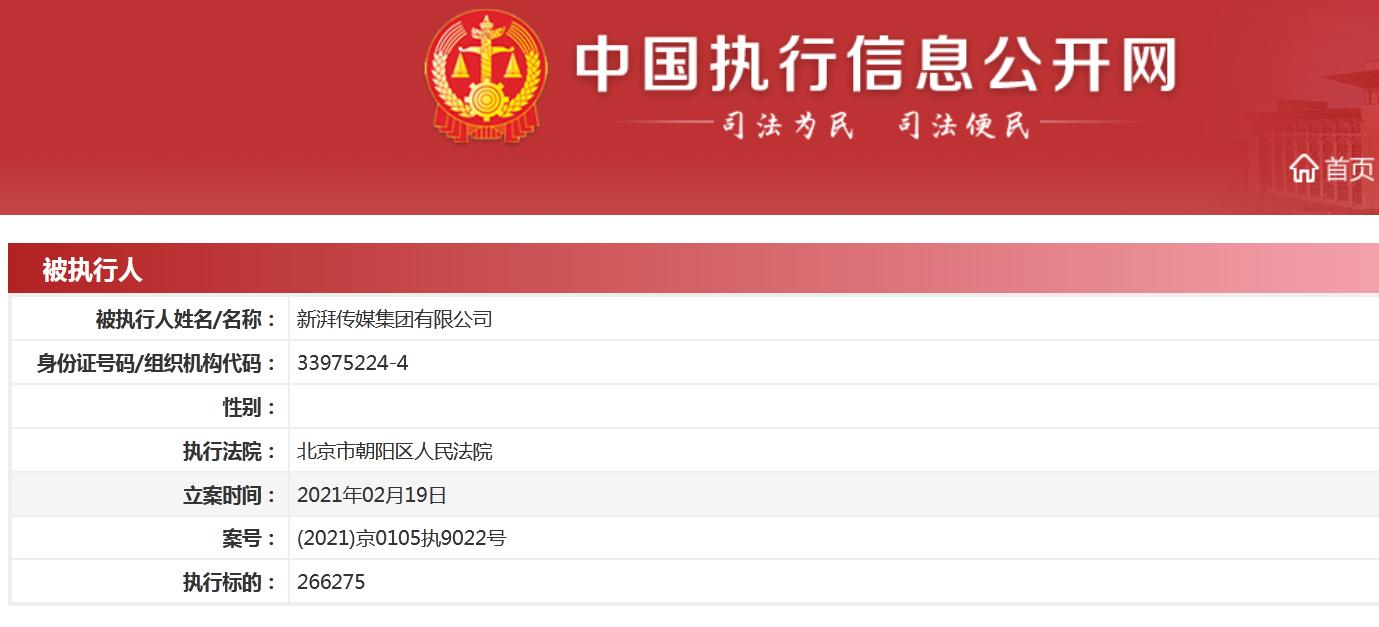 中新经纬客户端注意到,据中国执行信息公开网,新湃传媒集团有限公司被列为被执行人,执行法院为北京市朝阳区人民法院,立案时间2021年2月19日,案号(2021)京0105执9022号,执行标的266275元。