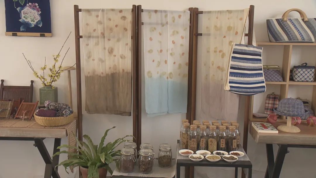 织布机旁摆放了很多玻璃瓶内有槐米、核桃皮、艾草等植物