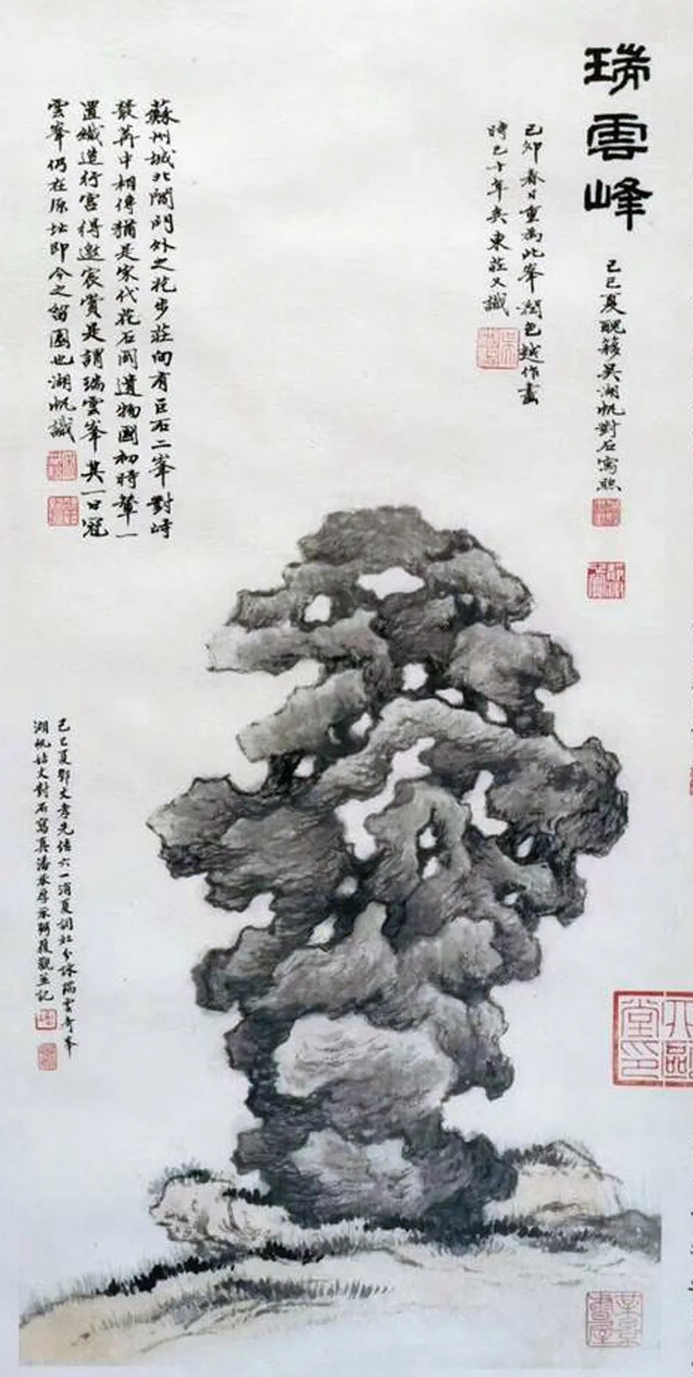 吴湖帆绘瑞云峰(局部)许多年前,笔者到苏州游玩,最使我难以忘怀的是游览狮子林时,在花厅前的一个天井中见到的一幅巧图,当我一眼看到这幅图案时,心情就难以平静。