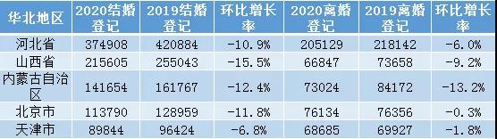 结婚登记方面,河北省(37.5万对)、山西省(21.6万对)分别占据前两位;离婚登记方面,占据前两位的则是河北省(20.5万对)和北京市(7.6万对)。