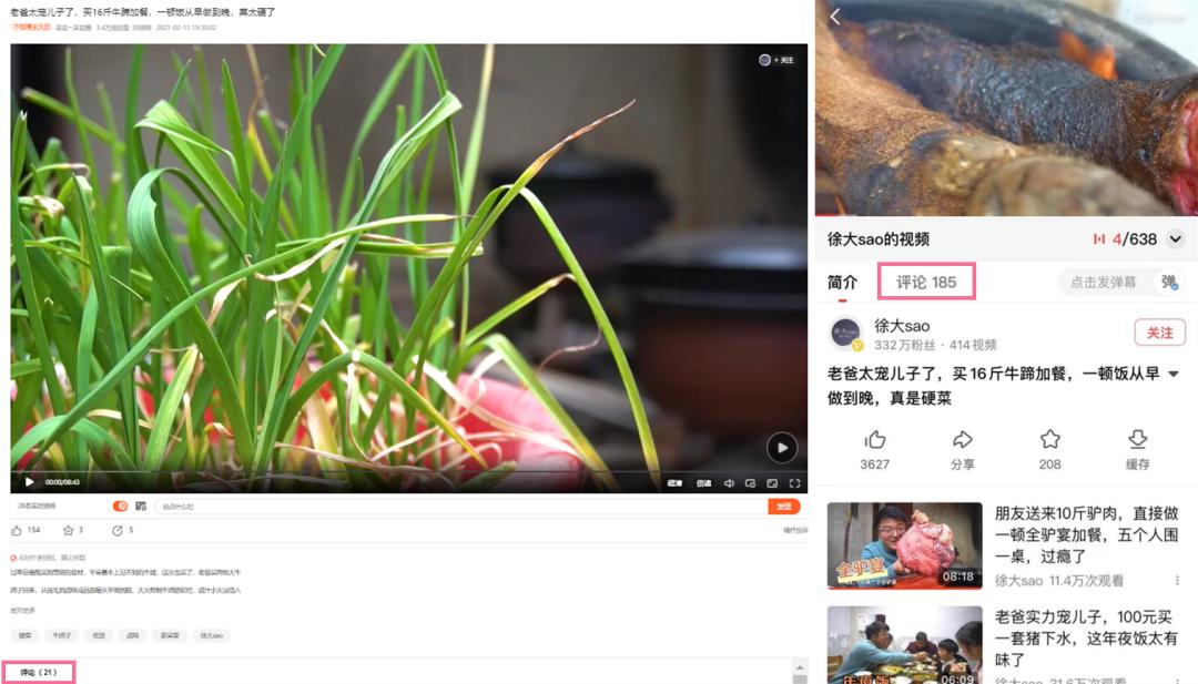 同样的尴尬情况也发生在其他入驻斗鱼的视频KOL上,李子柒的视频在斗鱼视频的播放量为10万左右,评论数平均20-30条。