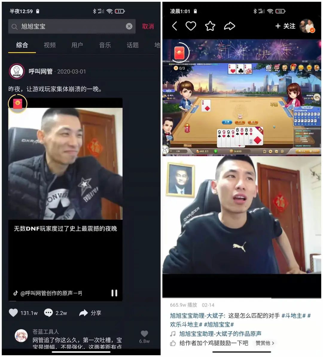 在快手上旭旭宝宝的认证账号只发布时长2分钟左右的斗地主视频,几乎没有DNF等其它游戏相关内容。