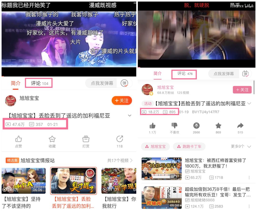 在B站上,旭旭宝宝官方账号的视频播放量从十万到百万上下,评论与弹幕数均在几百条左右。虽然斗鱼站内旭旭宝宝的播放量比B站要高,但视频评论和弹幕通常还不到B站数据的一半。