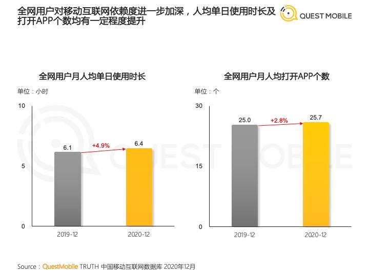 QuestMobile数据显示,2020年12月,国内移动互联网用户月人均单日使用移动互联网的时长是6.4小时。