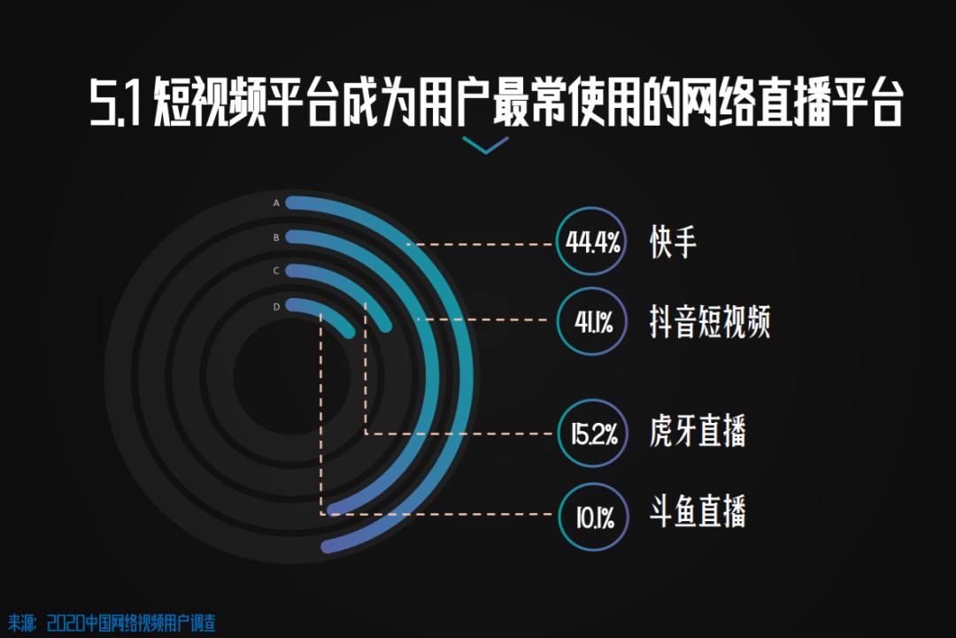 短视频平台已经成为用户最常使用的网络直播平台,44.4%用户看快手直播,41.1%用户看抖音直播,相比之下,只有15.2%的用户看虎牙直播,10.1%的用户看斗鱼直播。