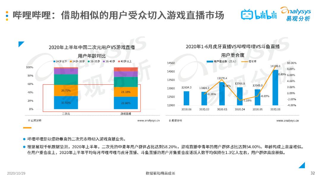 2020年Q2斗鱼虎牙月活用户合计3.3亿。根据易观的游戏直播报告数据,截止2020年6月,B站与斗鱼、虎牙的重合用户有1.4亿,这项数据仍有增长趋势。