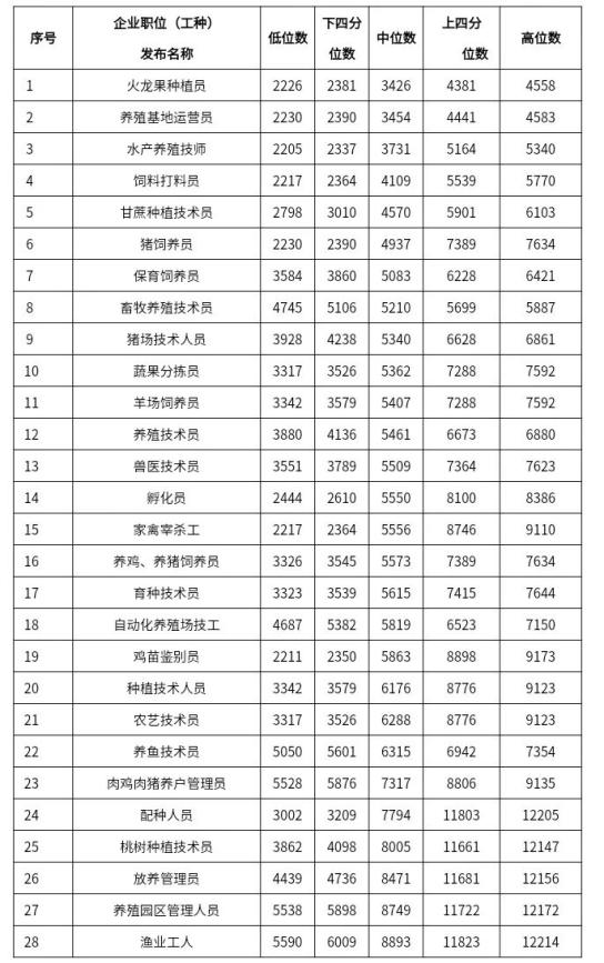 低位数、下四分位数、中位数、上四分位数、高位数5个档次,其中,中位数反映了每一个具体职位(工种)的工资按顺序排列的一组数据中居于中间位置的数。工资价位按职业大类分类和中位数升序排列。