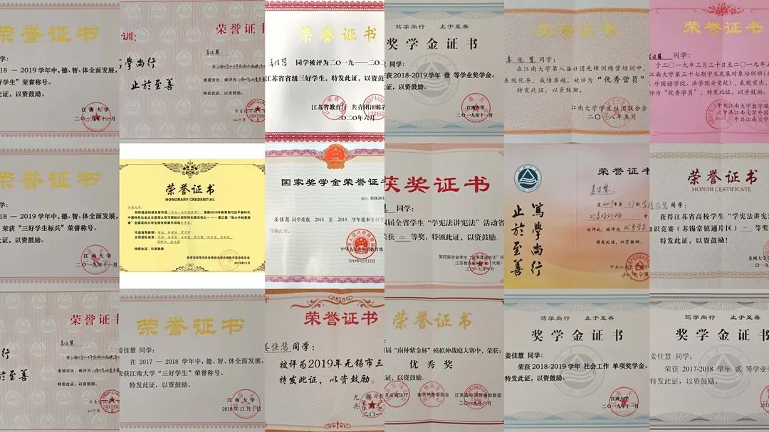 荣誉奖项合集姜佳慧深知知识的获取不能仅仅依靠有限时间的课堂,于是她把学习这件事放置在了她所能把握与利用的所有时间当中。阅读与思考,是她在课余最常做的事,除却专业学习,她对多领域的知识都广泛涉猎,哲学、文学、社会科学、政治、历史...仅在大一一学年,她就阅读了40余本书目,做了2个笔记本近500页笔记。阅读的习惯提高了她深入思考的能力与做事成事的定力,领会到了所谓学习之于人的宝贵意义。