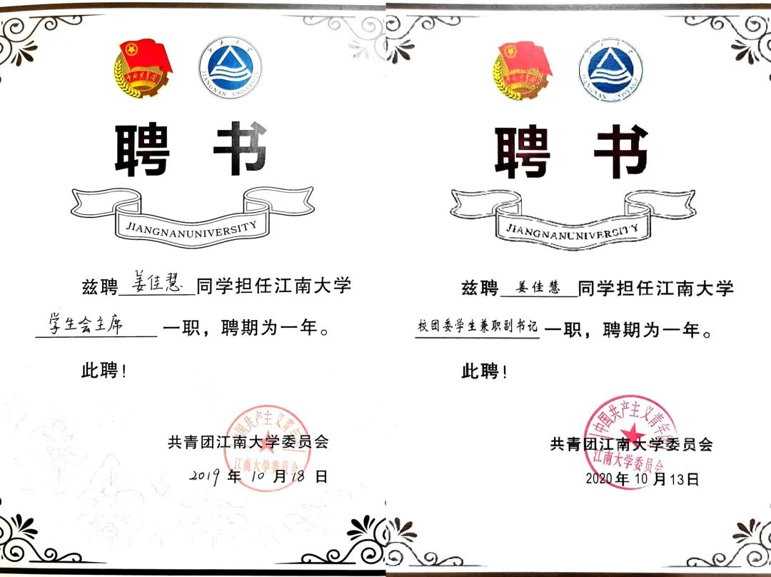 工作聘书学生工作期间收获成长的同时,她本人也荣获了省、市、校三级的三好学生以及江苏省优秀共青团员等荣誉称号,连续三年被评定为江南大学优秀共青团干部。