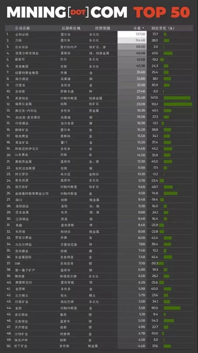 近日,加拿大Mining.com官网根据市场价值对全球矿业公司市值进行排名,选出了全球矿业公司50强,在这份榜单中,中国七大矿企上榜,而紫金矿业(601899.SH,02899.HK),则以第18名成为中国企业榜首。