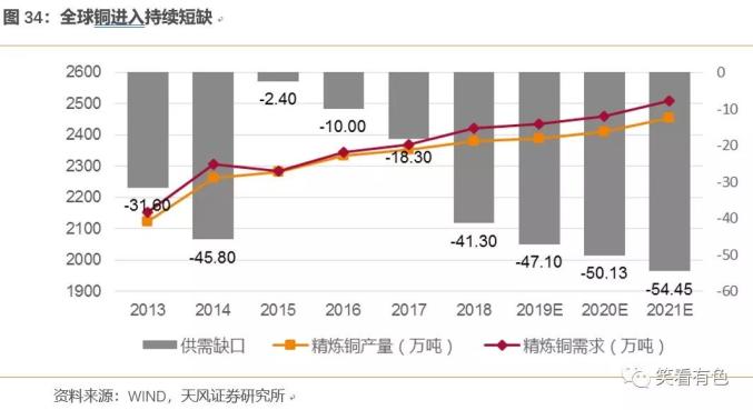 供给方面,据天风证券测算,虽然2018年铜矿供给增速小幅超预期,2019-2020年与预计铜矿投产增速不及冶炼产能。虽然冶炼产能大幅增加,但矿铜的供给制约精炼铜产能的释放。铜精矿短缺有望向下传导,精炼铜将形成供需缺口,并有扩大趋势。
