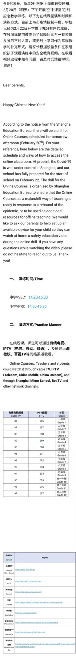 上海平和双语学校给同学和家长的开学提醒