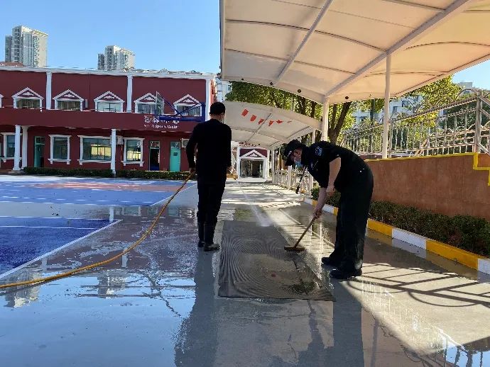教室里的每一个角落、走廊上的每一根护栏,都有他们用心守护,为师生顺利开启新学期保驾护航。并配备新学期的防疫物资,保障洗手液、手套、消毒用品一应俱全。