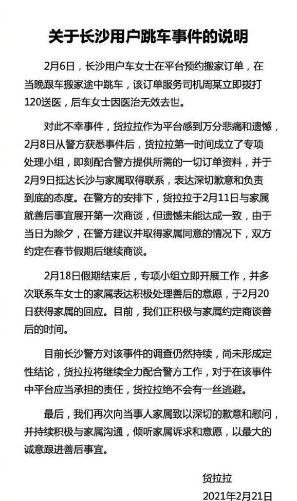 货拉拉表示,2月8日从警方获悉事件后,货拉拉第一时间成立了专项处理小组,即刻配合警方提供所需的一切订单资料,并于2月9日抵达长沙与家属取得联系,表达深切歉意和负责到底的态度。在警方的安排下,货拉拉于2月11日与家属就善后事宜展开第一次商谈,但遗憾未能达成一致,由于当日为除夕,在警方建议并取得家属同意的情况下,双方约定在春节假期后继续商谈。