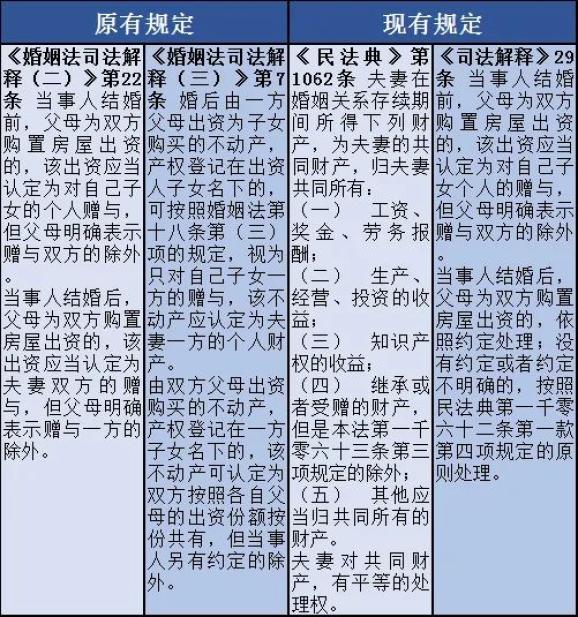 三、婚后父母为双方购置房屋出资的处理《司法解释》第29条对婚后父母为双方购置房屋出资的认定,和原《婚姻法司法解释(二)》《婚姻法司法解释(三)》相对比发生了重大变化,司法解释规定,在父母与子女之间没有约定或约定不明的情况下,无论权属登记情况,将推定为夫妻双方共同所有。