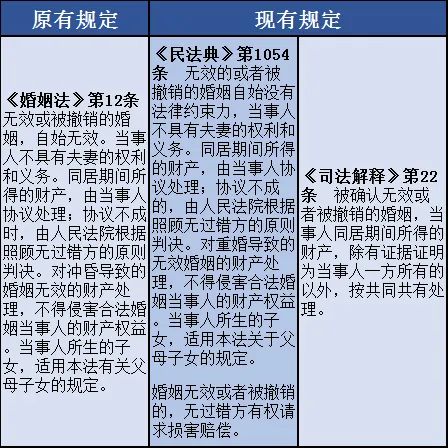 七、无效婚姻或者被撤销婚姻的财产处理无效婚姻或者被撤销婚姻所涉及财产的处理,《民法典》第1054条延续了原《婚姻法》的处理原则,即在保护合法婚姻的大前提下对无过错一方予以适当照顾,并明确了无过错方的损害赔偿请求权。《司法解释》明确了共同共有的处理原则,并明确了除外情形的举证责任。