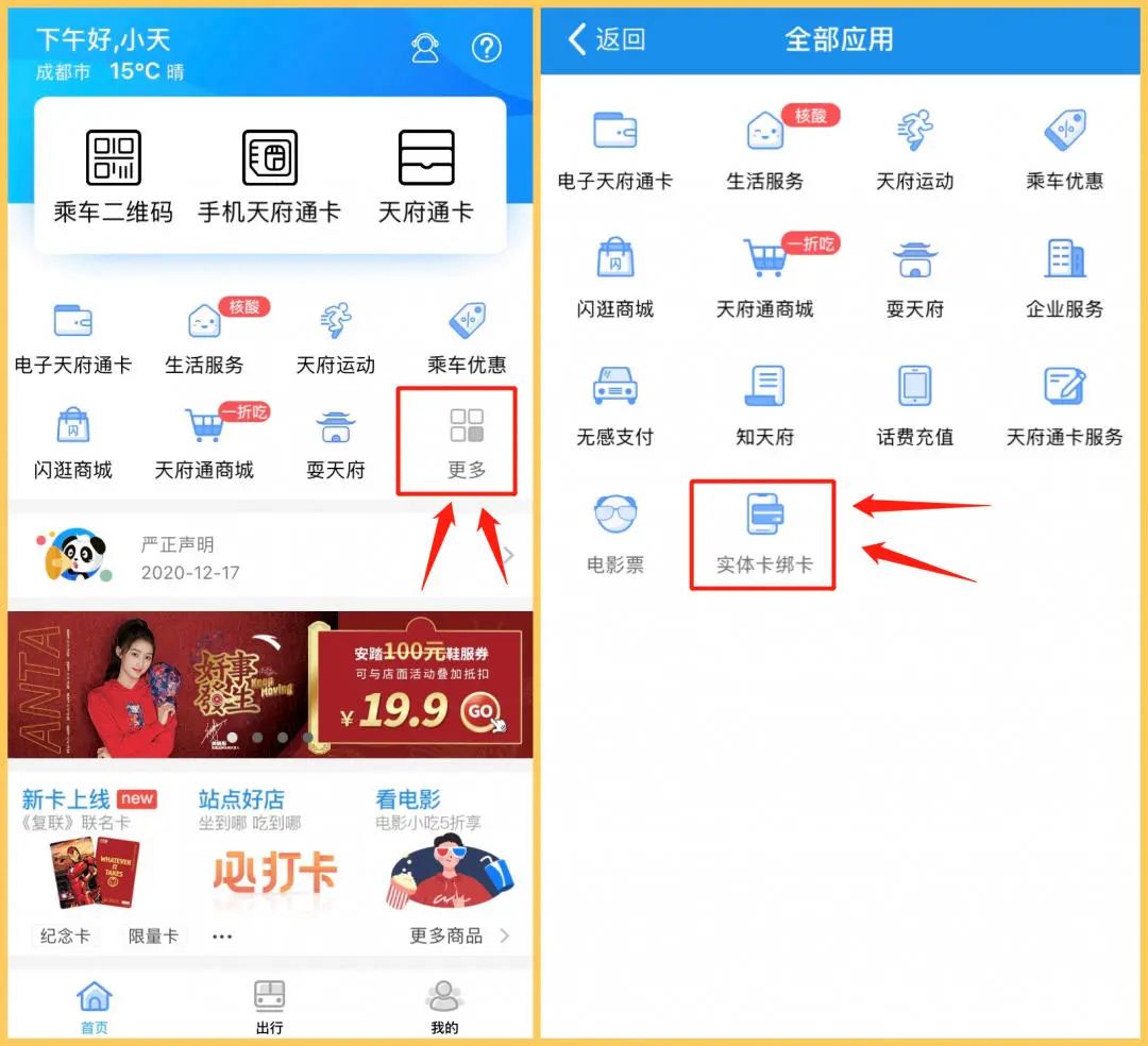 首先,打开天府通App,点击“更多”,找到“实体卡绑卡”;然后选择绑定自己或者家人的卡,并拍下清晰的卡号,确认无误后上传(如果卡号拍出来不清晰,也可以选择手动输入);最后填写乘车人的身份证号,通过验证后,就绑定成功啦!
