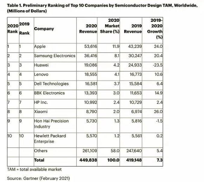 Gartner报告显示,排名前十的 OEM 厂商在2020年的半导体支出增长了10%,占总市场的42%,高于2019年的40.9%。