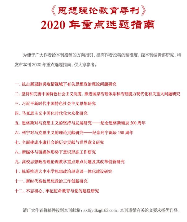 >>点击查阅《高校思想政治理论课教学研究》2020年第四期目录>>点击查阅《高校思想政治理论课教学研究》2019年全年目录>>点击查阅《思政课论文如何才能被“人大复印”转载?》