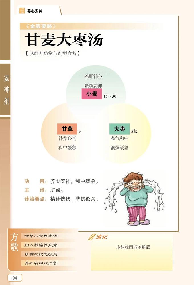甘麦大枣汤,就只有甘草、小麦和大枣三味药,但养心安神效果特别好。这个方可以治疗脏躁,指的是精神抑郁,心中烦乱。我有一位友人曾受更年期综合征的困扰,我想到了《本草纲目》这段记载,就向她推荐了甘麦大枣汤,效果十分显著。