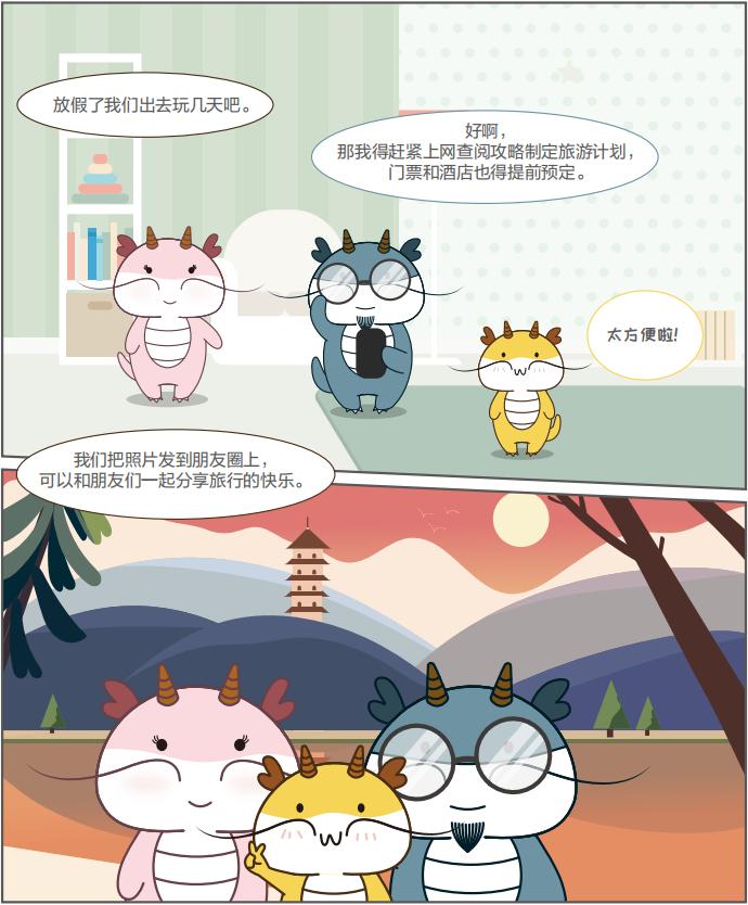 设计师选取小安君作为“科普老师”的形象,同时设计了小龙人一家,小龙人、龙爸、龙妈作为个性分明的漫画主人公,以及小龙人的小伙伴们共同学习,人物神态各异、表情逗趣,演绎了不同网络安全场景,陪伴我们一路成长、收获知识。