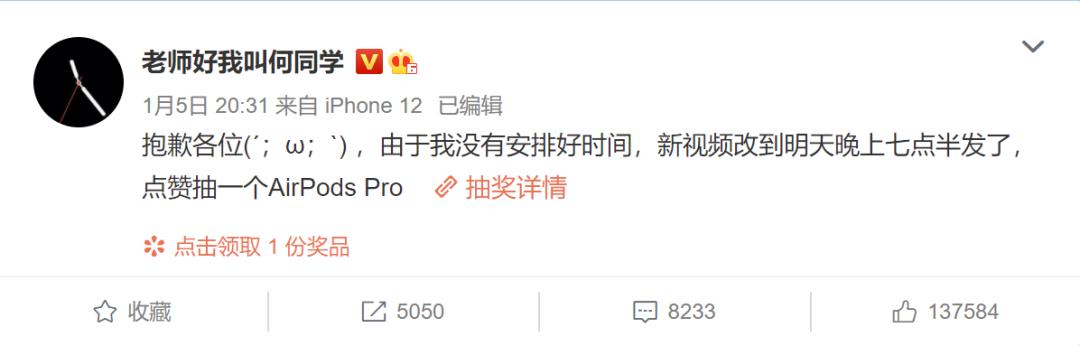 “抱歉各位(´;ω;`) ,由于我没有安排好时间,新视频改到明天晚上七点半发了,点赞抽一个AirPods Pro。”